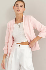 The Open Front Ruched Sleeve Blazer is a sophisticated and stylish outerwear option. With its open front design, this blazer offers a chic and versatile look that can easily transition from day to night. The ruched sleeves add a touch of elegance and flair to the classic blazer silhouette. Perfect for adding a polished touch to any outfit, this blazer is a must-have for your professional wardrobe. Whether for a formal event or a casual outing, this blazer is sure to elevate your style. Make a fashion statement with the Open Front Ruched Sleeve Blazer and exude confidence and sophistication wherever you go!
