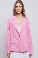 Step up your fashion game with this sophisticated One-Button Long Sleeve Linen Blazer that offers a timeless and polished look. The single-button closure adds a touch of elegance to the classic blazer silhouette. Crafted from lightweight linen fabric, this blazer is perfect for layering during transitional seasons. The long sleeves provide versatility for both casual and dressy outfits. Whether paired with tailored pants for a professional ensemble or dressed down with jeans for a smart-casual look, this blazer is a versatile wardrobe staple. Elevate your style with this chic and structured One-Button Long Sleeve Linen Blazer that effortlessly combines comfort and sophistication.