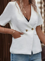 Sizing category: Regular Pattern type: Solid Style: Chic, casual Features: Double-breasted Neckline: V-neck Length: Regular Sleeve length: Short sleeves Sleeve type: Regular sleeves Material: 100% polyester Stretch: No stretch Sheer: No Body: Not lined Care...