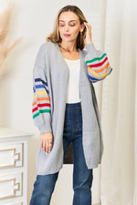 The Multicolored Stripe Open Front Longline Cardigan is a vibrant and eye-catching piece that adds a playful touch to any ensemble. With its longline silhouette and bold multicolored stripes, this cardigan is a perfect choice for layering and creating a fashionable and cozy look.