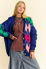 The Argyle V-Neck Dropped Shoulder Cardigan is a stylish and sophisticated choice for your wardrobe. The classic argyle pattern adds a timeless touch to this modern piece. With a v-neckline and dropped shoulder design, it exudes a relaxed and effortlessly chic vibe. Layer this cardigan over your outfits for a cozy and fashionable look that transitions seamlessly from work to weekend.