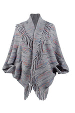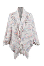 Pattern type: Solid Style: Classy, Casual Features: Fringe Neckline: Open front Length: Long Sleeve length: Three-quarter sleeves Sleeve type: Cloak sleeves Material composition: 100% polyester Stretch: Moderate stretch Care instructions: Machine wash cold. Tumble dry...
