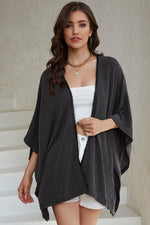 Pattern type: Solid Style: Casual Features: Basic style Neckline: Open front Length: Long Sleeve length: Three-quarter sleeves Sleeve type: Dolman sleeves Sheer: Opaque Material composition: 65% polyester, 30% viscose, 5% spandex Stretch: Slightly stretchy Care...