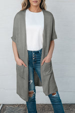 Pattern type: Solid Style: Casual Features: Pockets Neckline: Open front Length: Long Sleeve length: Short sleeves Sleeve type: Raglan sleeves Material composition: 100% acrylic Stretch: No stretch Care instructions: Machine wash cold. Tumble dry low....