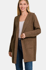This hooded open front sweater cardigan features a cozy hood and an open front design for effortless layering. The addition of front pockets adds both style and functionality to this cardigan, making it a versatile and practical choice for your wardrobe. Perfect for staying cozy and stylish on cooler days, this cardigan is a chic and comfortable layering piece for any outfit.