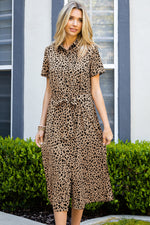 Pattern type: Leopard Style: Casual Features: Tie Neckline: Collared neck Length: Midi Sleeve length: Short sleeves Sleeve type: Regular sleeves Hem shaped: A-line Sheer: No Body: Not lined Material composition: 100% polyester Stretch: No stretch...
