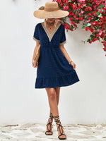 Pattern type: Solid Style: Chic Features: Swiss dot, Ruffle Neckline: V-neck Length: Mini Sleeve length: Short sleeves Sleeve type: Regular sleeves Hem shaped: A-line Sheer: No Body: Not lined Material composition: 95% polyester, 5% spandex...