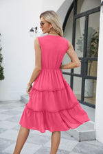 Pattern type: Solid Style: Casual Features: Frill Neckline: V-neck Length: Midi Sleeve length: Sleeveless Sleeve type: Sleeveless Hem shaped: A-line Sheer: No Body: Not lined Material composition: 100% polyester Stretch: Slightly stretchy Care instructions: Hand...