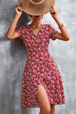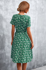 Type: Casual dresses Sizing category: Regular Pattern type: Floral Style: Classy Features: Basic style Neckline: Surplice Length: Knee Length Sleeve length: Short sleeves Sleeve type: Flutter sleeves Material: 95% polyester, 5% spandex Stretch: No stretch...