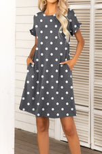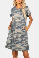 Pattern type: Solid Style: Chic Features: Frill, Pockets Neckline: Round neck Length: Mini Sleeve length: Short sleeves Sleeve type: Regular sleeves Hem shaped: Straight Sheer: No Body: Not lined Material composition: Green Camouflage/Leopard/Dark Gray: 65%...