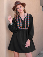 Pattern type: Bohemian Style: Tropical Features: Basic style Neckline: Notched Length: Midi Sleeve length: Long sleeves Sleeve type: Regular sleeves Hem shaped: A-line Sheer: Opaque Body: Not lined Material composition: 49% viscose, 34% polyester, 17%...