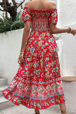 Pattern type: Floral Style: Vacation Features: Smocked Neckline: Off-shoulder Length: Midi Sleeve length: Short sleeves Sleeve type: Cold-shoulder Hem shaped: A-line Sheer: No Body: Not lined Material composition: 100% viscose Stretch: No stretch Care instructions:...