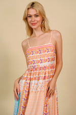 Pattern type: Printed Style: Chic Features: Smocked Neckline: Straight Length: Midi Sleeve length: Sleeveless Sleeve type: Spaghetti straps Hem shaped: A-line Sheer: No Body: Not lined Material composition: 100% polyester Stretch: No stretch Care instructions:...
