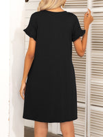 Pattern type: Solid Style: Casual Features: Pockets Neckline: Round neck Length: Mini Sleeve length: Short sleeves Sleeve type: Regular sleeves Hem shaped: A-line Sheer: No Body: Not lined Material composition: 65% polyester, 30% viscose, 5%...