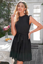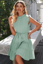 Pattern type: Solid Style: Classy Features: Tie, tiered, frill Neckline: Ruffle collar Length: Mini Sleeve length: Cap sleeves Sleeve type: Sleeveless Hem shaped: A-line Sheer: No Body: Not lined Material composition: 100% polyester Stretch: No...