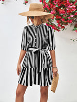 Pattern type: Striped Style: Chic Features: Belted, Buttoned Neckline: Mock neck Length: Mini Sleeve length: Half sleeves Sleeve type: Regular sleeves Hem shaped: A-line Sheer: No Body: Not lined Material composition: 95% polyester, 5% spandex...