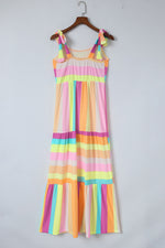 Pattern type: Multicolored Style: Vacation Features: Tie, tiered Neckline: Square neck Length: Maxi Sleeve length: Sleeveless Sleeve type: Sleeveless Hem shaped: Straight Sheer: No Body: Not lined Material composition: 95% polyester, 5% spandex Stretch: Slightly...