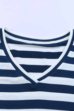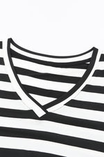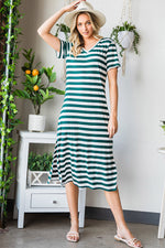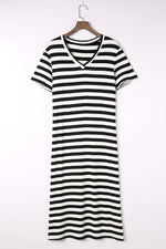Pattern type: Striped Style: Casual Features: Slit Neckline: V-neck Length: Midi Sleeve length: Short sleeves Sleeve type: Regular sleeves Hem shaped: Slit Sheer: No Body: Not lined Material composition: 50% polyester, 45% viscose, 5% spandex...