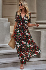 Pattern type: Floral Style: Classy Features: Frill Neckline: V-neck Length: Maxi Sleeve length: Short sleeves Sleeve type: Flounce sleeves Hem shaped: A-line Sheer: No Body: Lined Material composition: 100% polyester Stretch: No stretch Care instructions:...