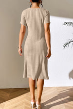 Pattern type: Solid Style: Urban, Casual Features: Asymmetrical Neckline: Asymmetrical neck Length: Knee length Sleeve length: Short sleeves Sleeve type: Regular sleeves Hem shaped: Slit Sheer: Opaque Body: Not lined Material composition: 95% polyester, 5%...