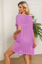 Pattern type: Solid Style: Beach Features: Openwork Neckline: Round neck Length: Mini Sleeve length: Short sleeves Sleeve type: Raglan sleeves Hem shaped: Straight Material composition: 100% viscose Stretch: Slightly stretchy Care instructions: Machine wash cold....