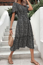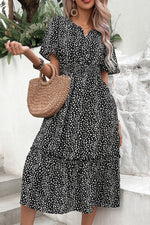 Pattern type: Printed Style: Vacation Features: Ruffle Neckline: Notched Length: Midi Sleeve length: Short sleeves Sleeve type: Regular sleeves Hem shaped: A-line Sheer: No Body: Not lined Material composition: 100% polyester Stretch: No stretch Care...