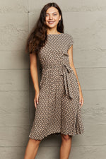 Pattern type: Printed Style: Chic Features: Belted Neckline: Round neck Length: Knee length Sleeve length: Short sleeves Sleeve type: Regular sleeves Hem shaped: A-line Sheer: Opaque Body: Not lined Material composition: 100% polyester Stretch: No...