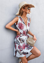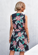 Type: Casual dresses Sizing category: Regular Pattern type: Printed Style: Chic, classy Features: Belted Neckline: V-neck Length: Mini Sleeve length: Sleeveless Sleeve type: Sleevless Material: 95% polyester, 5% spandex Stretch: No stretch Sheer: No Body:...
