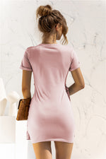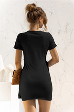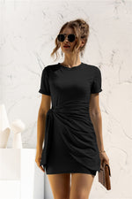 Type: Casual dresses Sizing category: Regular Pattern type: Solid Style: Chic, classy Features: Ruched Neckline: Round neck Length: Mini Sleeve length: Short sleeves Sleeve type: Regular sleeves Material: 95% polyester, 5% spandex Stretch: Moderate stretch...