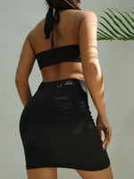 Type: Cocktail dresses Sizing category: Regular Pattern type: Solid Style: Chic, classy Features: Tie Neckline: Halter neck Length: Mini Sleeve length: Sleeveless Sleeve type: Sleeveless Material: 95% polyester, 5% spandex Stretch: Slightly stretchy Sheer: No...