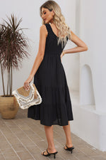 Pattern type: Solid Style: Chic Features: Frill, Ruffle Neckline: Round neck Length: Midi Sleeve length: Sleeveless Sleeve type: Sleeveless Hem shaped: A-line Sheer: No Body: Not lined Material composition: 55% viscose, 45% polyester Stretch: No...
