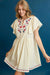 This charming bohemian-style mini dress features beautiful multicolored floral embroidery across the chest and hem, creating an eye-catching focal point. Made from lightweight cotton blend fabric, it offers comfort and breathability. The flutter sleeves add a romantic touch while the elastic waist ensures a flattering fit. The tassel-tied neckline brings playful detail to this versatile piece. Perfect for casual outings, beach vacations, or summer gatherings. The cream base color makes it easy to accessorize, while the vibrant embroidered flowers in red, blue, and pink add a pop of color. This dress combines comfort with style, making it an essential addition to any bohemian or casual wardrobe.