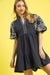 This stylish mini dress features a sophisticated V-neck collar design with eye-catching tropical leaf print sleeves that contrast beautifully with the solid navy body. The empire waist creates a flattering silhouette while the tiered ruffle hem adds feminine movement and charm. Made from comfortable lightweight fabric perfect for warm weather, this versatile piece combines casual comfort with fashion style. The short sleeves provide coverage while maintaining a breezy feel, making it ideal for summer outings, beach vacations, or casual gatherings. The pullover design ensures easy wear while the mini length keeps the look fresh and youthful.