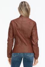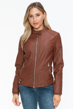 A faux leather biker jacket with side zip pockets is a trendy and edgy piece that combines style with functionality. This type of jacket is typically designed with a classic biker silhouette, featuring a front zipper closure, epaulets on the shoulders, and side zip pockets for a modern touch. The faux leather material gives a sleek and fashionable look, while the side zip pockets add both style and practicality. This jacket is versatile and can add a cool and rebellious element to your outfit.
