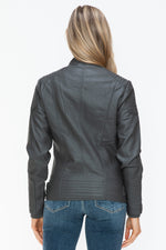 A faux leather biker jacket with side zip pockets is a trendy and edgy piece that combines style with functionality. This type of jacket is typically designed with a classic biker silhouette, featuring a front...