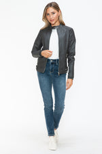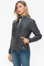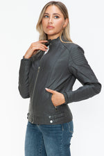 A faux leather biker jacket with side zip pockets is a trendy and edgy piece that combines style with functionality. This type of jacket is typically designed with a classic biker silhouette, featuring a front zipper closure, epaulettes on the shoulders, and side zip pockets for a modern touch. The faux leather material gives a sleek and fashionable look, while the side zip pockets add both style and practicality. This jacket is versatile and can add a cool and rebellious element to your outfit.