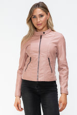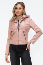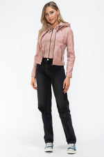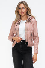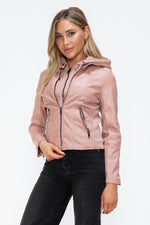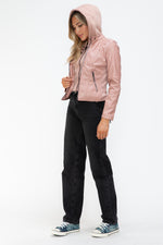 A faux leather zip-up drawstring hooded jacket is a stylish and versatile piece made from artificial leather material. This type of jacket features a front zipper closure for easy wear, a drawstring hood that adds a casual and sporty touch, and typically has long sleeves. The drawstring allows for an adjustable fit around the hood, providing both style and functionality. This jacket is perfect for adding a chic and edgy element to your outfit while offering some protection against the weather.