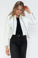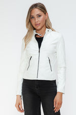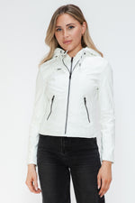 A faux leather zip-up drawstring hooded jacket is a stylish and versatile piece made from artificial leather material. This type of jacket features a front zipper closure for easy wear, a drawstring hood that adds a casual and sporty touch, and typically has long sleeves. The drawstring allows for an adjustable fit around the hood, providing both style and functionality. This jacket is perfect for adding a chic and edgy element to your outfit while offering some protection against the weather.
