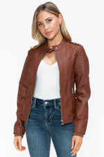 A PU leather biker jacket with side zip pockets is a stylish and edgy piece that combines classic biker aesthetics with modern design elements. This jacket is typically made from faux leather, featuring a front zipper closure, shoulder epaulettes, and convenient side zip pockets for added style and functionality. Perfect for adding a touch of rebellion to your outfit, this versatile jacket is a fashion staple that exudes attitude and sophistication.