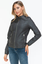 A PU leather biker jacket with side zip pockets is a stylish and edgy piece that combines classic biker aesthetics with modern design elements. This jacket is typically made from faux leather, featuring a front zipper closure, shoulder epaulettes, and convenient side zip pockets for added style and functionality. Perfect for adding a touch of rebellion to your outfit, this versatile jacket is a fashion staple that exudes attitude and sophistication.