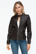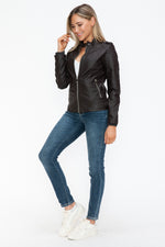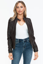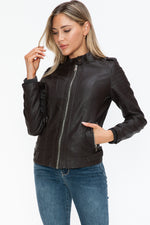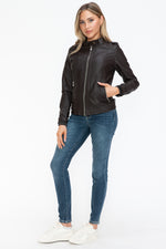 A PU leather biker jacket with side zip pockets is a stylish and edgy piece that combines classic biker aesthetics with modern design elements. This jacket is typically made from faux leather, featuring a front zipper closure, shoulder epaulettes, and convenient side zip pockets for added style and functionality. Perfect for adding a touch of rebellion to your outfit, this versatile jacket is a fashion staple that exudes attitude and sophistication.