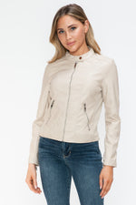 A PU leather zip-up jacket with pockets is a stylish and practical piece made from faux leather material. This type of jacket typically features a front zipper closure for easy wear, as well as functional pockets for storing small essentials. The PU leather material gives a sleek and fashionable look, while the zip-up design adds a modern touch. This jacket is versatile and can be worn in various settings, providing both style and functionality.