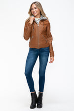 The Faux Layered Double-Zipper Jacket with Fuzzy Hood is a stylish and versatile outerwear option. This jacket features a faux layered design that gives the appearance of wearing multiple pieces, while the fuzzy hood adds a cozy and trendy touch. The double-zipper detail adds a unique flair to the jacket, making it a fashion-forward choice for the season. Stay warm and on-trend with this chic and practical jacket in your wardrobe.