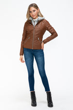 The Faux Layered Double-Zipper Jacket with Fuzzy Hood is a stylish and versatile outerwear option. This jacket features a faux layered design that gives the appearance of wearing multiple pieces, while the fuzzy hood adds a cozy and trendy touch. The double-zipper detail adds a unique flair to the jacket, making it a fashion-forward choice for the season. Stay warm and on-trend with this chic and practical jacket in your wardrobe.