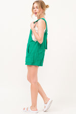 A button-up tie-back sleeveless romper is a fun and trendy piece for the summer season. This romper typically features a button-up front detail, a tie-back design that adds a cute and adjustable element, and a sleeveless style that is perfect for warm weather. Rompers are great for a casual day out, a beach trip, or a music festival as they are comfortable and effortless to wear. Pair this romper with some sandals or sneakers for a laid-back look, and add some sunglasses and a sunhat to complete your summer ensemble.