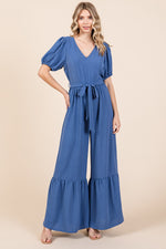 The V-Neck Belted Wide Leg Jumpsuit is a sleek and sophisticated choice for a stylish and contemporary look. Featuring a flattering V-neckline and wide-leg silhouette, this jumpsuit offers a chic and elongating effect. The belt cinches at the waist to accentuate your figure and add a touch of definition. Perfect for both casual and dressy occasions, this jumpsuit can be dressed up with heels or styled casually with sneakers. Made from quality fabric, it is comfortable and versatile for all-day wear. Elevate your outfit effortlessly with this fashionable and flattering V-neck belted wide leg jumpsuit!