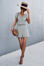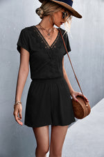 Sizing category: Regular Pattern type: Solid Style: Chic Features: Lace Neckline: V-neck Length: Short Sleeve length: Short sleeves Sleeve type: Regular sleeves Material: 95% polyester, 5% spandex Stretch: Moderate stretch Sheer: No Body: Not lined...