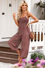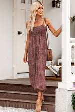 Pattern type: Printed Style: Casual Features: Smocked Neckline: V-neck Length: Long Sleeve length: Sleeveless Sleeve type: Spaghetti straps Material composition: 95% polyester, 5% spandex Stretch: Slightly stretchy Care instructions: Machine wash cold. Tumble dry low....