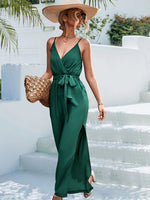 Sizing category: Regular Pattern type: Solid Style: Casual, vacation Features: Split, tie Neckline: Plunge Length: Long Sleeve length: Sleeveless Sleeve type: Spaghetti straps Material: 95% polyester, 5% spandex Stretch: No stretch Sheer: No Body: Not...