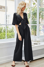 - Feature: Elbow sleeves, tie front, elastic waist, wide leg